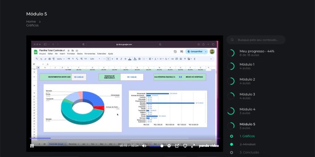 No módulo final mostra os gráficos da planilha e temos uma aula de mindset, uma virada na chave da mente que vai te levar a um novo patamar.